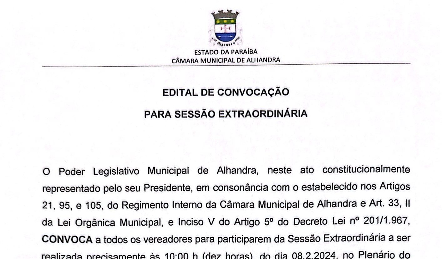 Sessão Extraordinária a ser realizada precisamente às 10:00 horas do dia 13.01.2025, Excepcionalmente no Plenário do prédio do Anexo do Poder Legislativo do Município de Alhandra